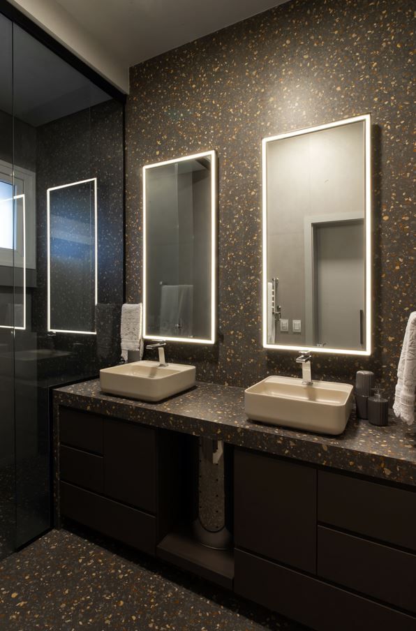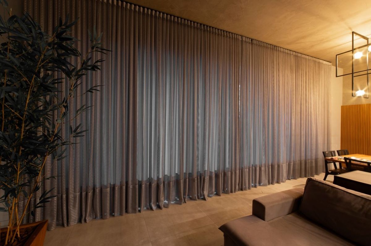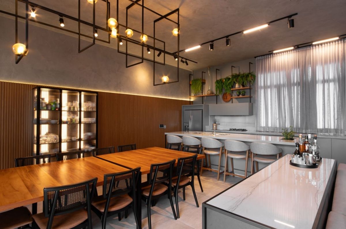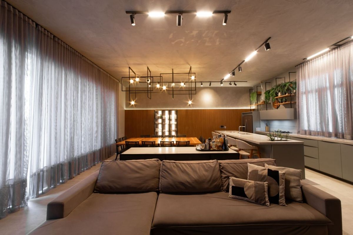 Sempre fui apaixonada pelos tons de cinza quente na arquitetura, que trazem aconchego e elegância ao mesmo tempo. O pé-direito alto e a iluminação quente complementam essa sensação de amplitude e conforto.