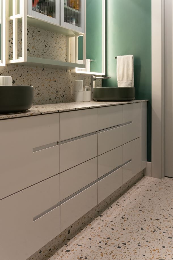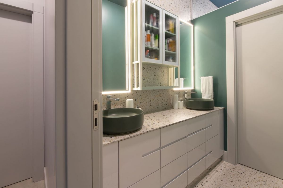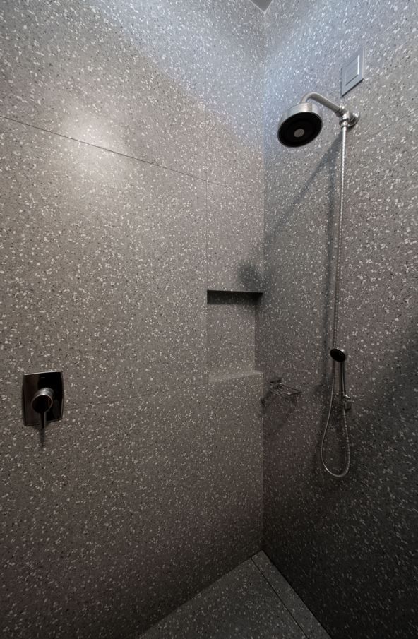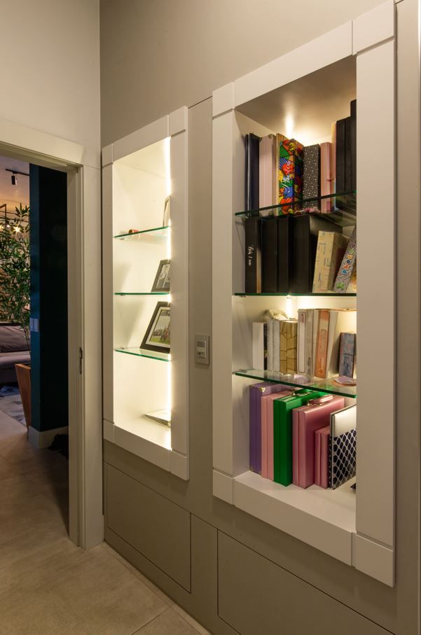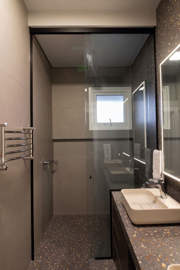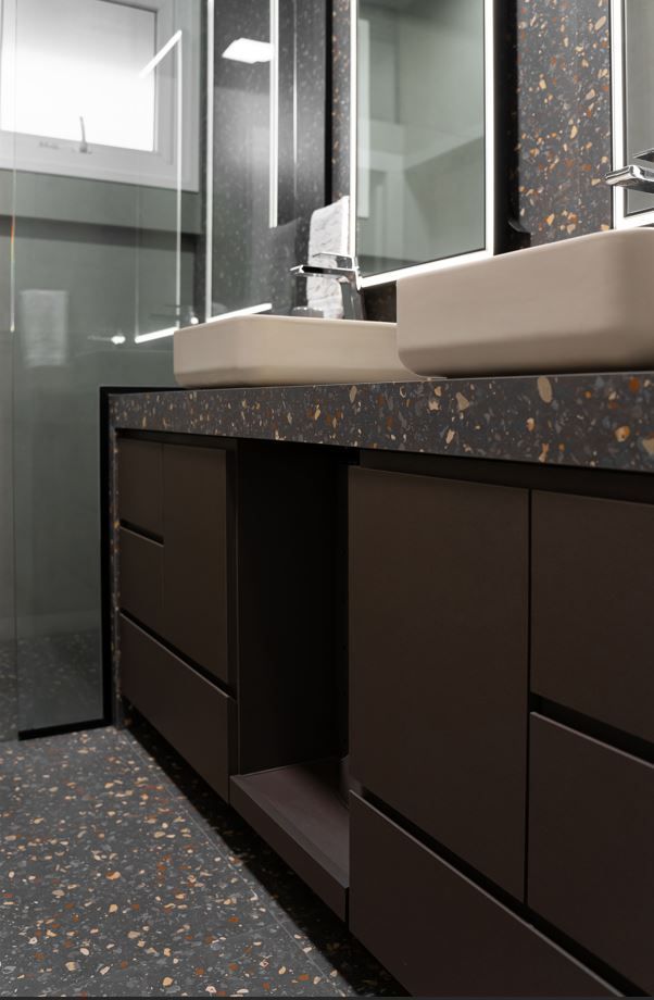 Sempre fui apaixonada pelos tons de cinza quente na arquitetura, que trazem aconchego e elegância ao mesmo tempo. O pé-direito alto e a iluminação quente complementam essa sensação de amplitude e conforto.