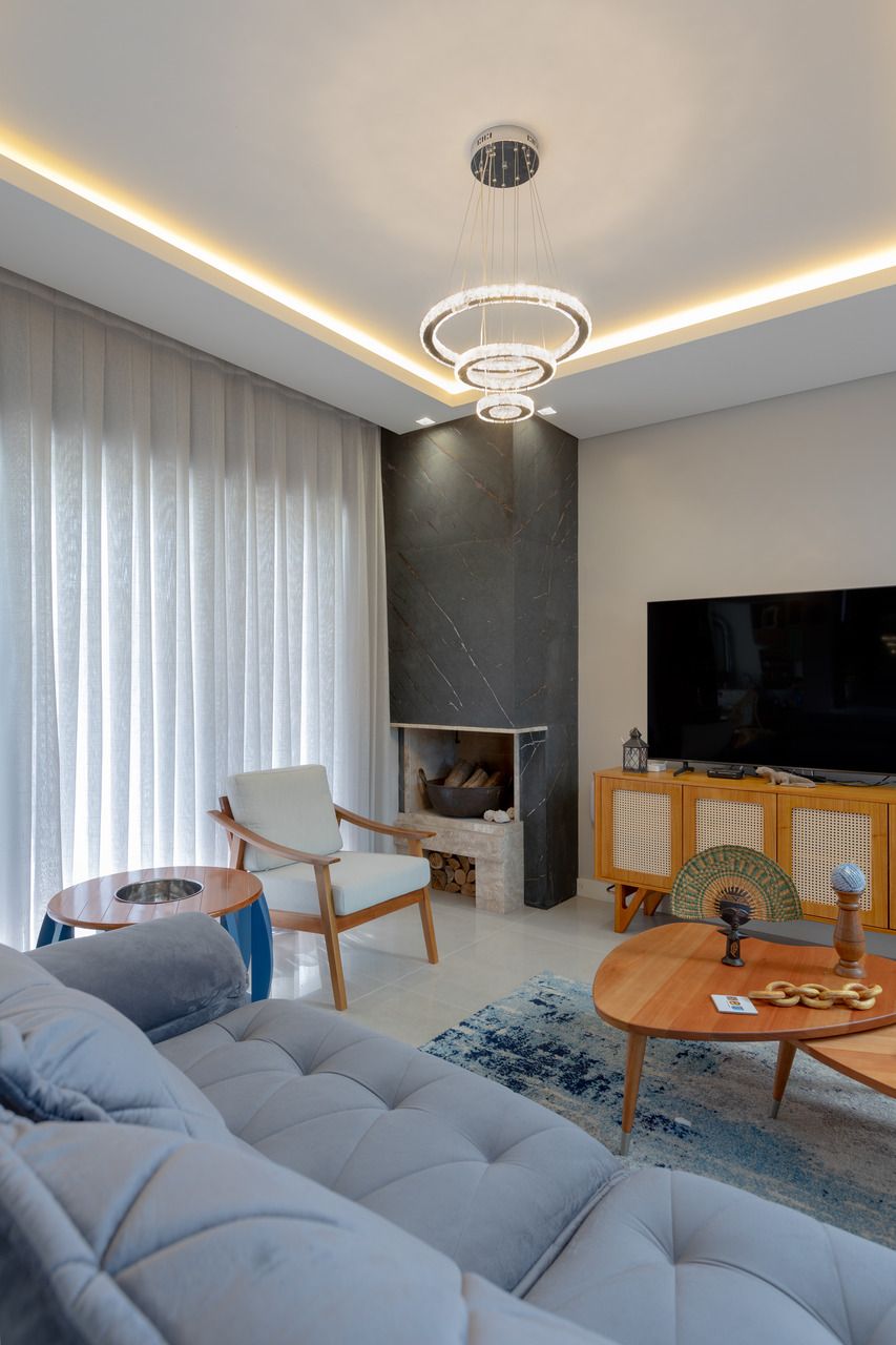 O projeto de interiores valoriza sobretudo a cozinha como centro de integração com os outros espaços, a cor escolhida é predominantemente o azul, trazendo sofisticação para a composição. Um cuidado todo especial com a iluminação, composta por perfis de led para luz global, conforto ao ambiente, iluminação focal na ilha e luzes de destaque nos móveis.
